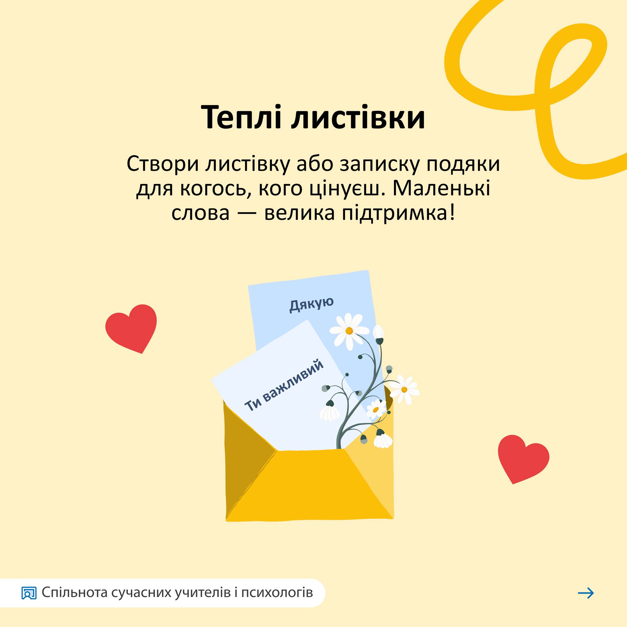 Попросіть учнів записати або намалювати свої добрі вчинки на кольорових смужках паперу. Потім з’єднайте їх у довгий ланцюг доброти — символ вашого класного єднання.