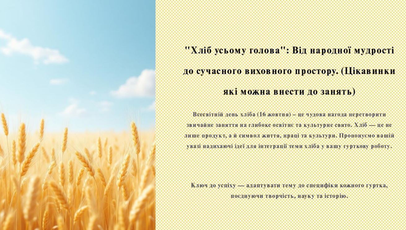 ✔ Виховна година "Хліб усьому голова" до Всесвітнього дня хліба. (ЗАВАНТАЖИТИ)
