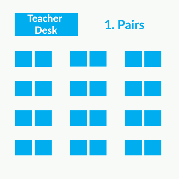Почнемо з одного з найбільш використовуваних рішень для розміщення учнів за партами: пари. При такій організації вони можуть працювати і окремо, і в парах. Також ви тут можете розділити учнів на три групи. Хай кожний ряд придумає назву своїй команді.
