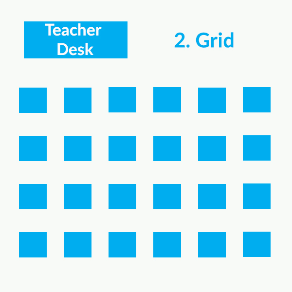 Таке розташування сидінь особливо зручне під час тестування учнів або коли ви хочете, щоб вони працювали індивідуально. Вони не можуть розмовляти один з одним або списувати. Не використовуйте цей стиль розташування парт на постійній основі. Учні можуть стати демотивованими, оскільки їм нема з ким «шепотіти».