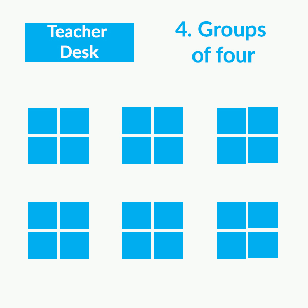 Сформуйте групи з чотирьох учнів, коли ви хочете, щоб ваші учні об'єднали свої зусилля. Вони можуть попрацювати окремо, або всі разом, і потім обговорити завдання. Таке розташування парт дозволяє дітям навчитися працювати в команді, краще познайомитися один з одним, можливо, налагодити нові дружні стосунки.