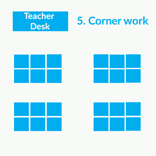 Ця організація сидінь буде доречною для багатьох видів роботи – і для засвоєння нової теми, і для закріплення матеріалу. Так, в одному куточку діти можуть разом вирішувати кросворд, в іншому робити інтелектуальну карту, в третьому дивитиися відео і знаходити в ньмому відповіді на питання тощо. Потім всі команди переміщуються. Також ви можете використати цей розподіл, якщо вам потрібно розділити дітей з різним рівнем успішності засвоєння теми.