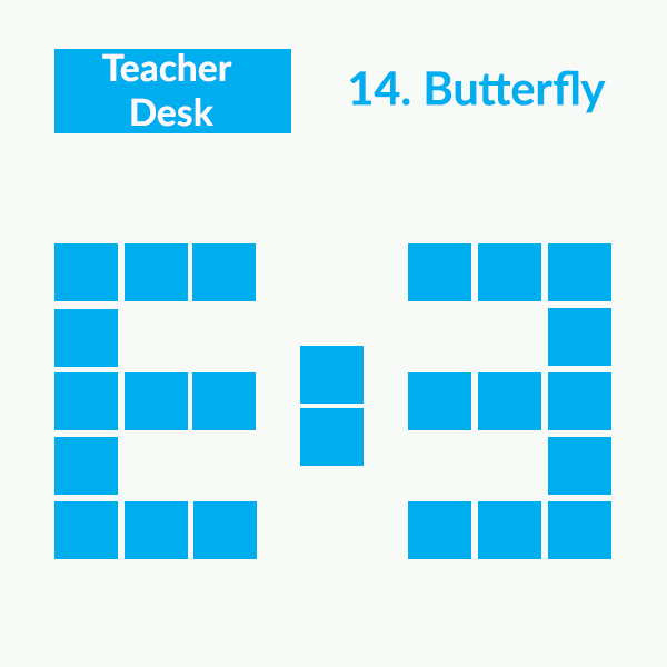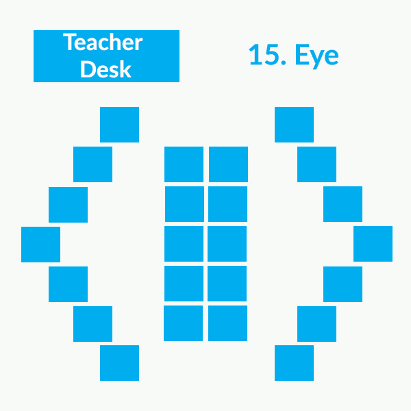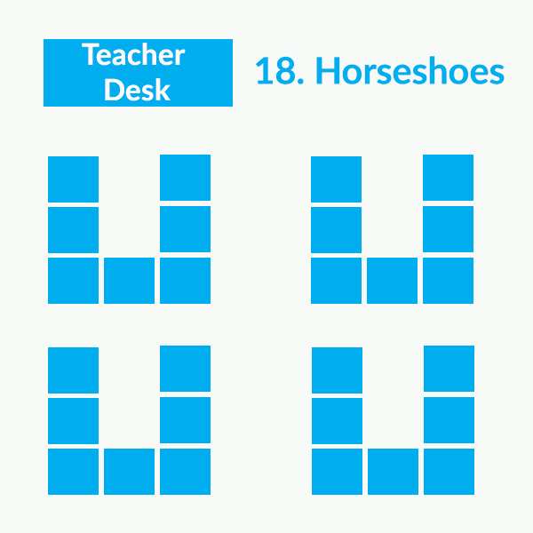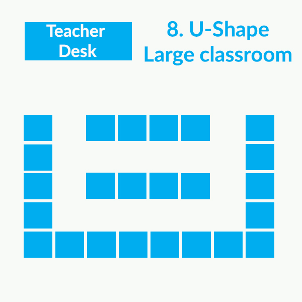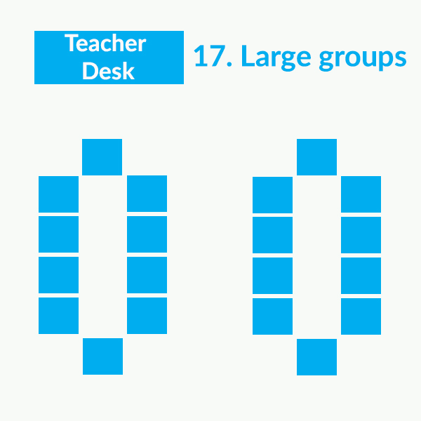 У вас є великий клас і багато учнів? Тоді ви точно можете використовувати цю організацію класного приміщення. На відміну від подвійної підкови, ця форма у великому класі не відокремлює учнів. Спереду немає окремої підкови, що робить простір більш відкритим для студентів ззаду.