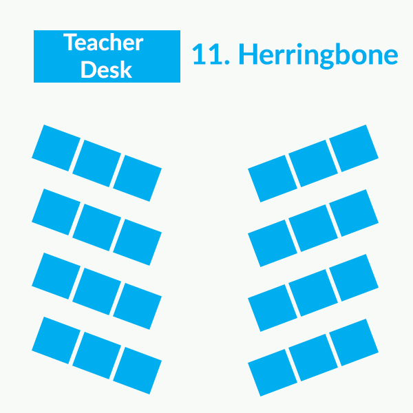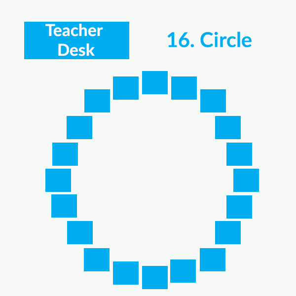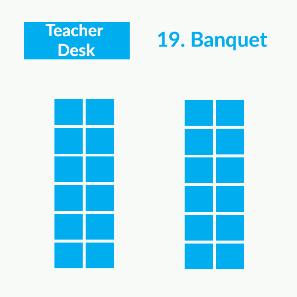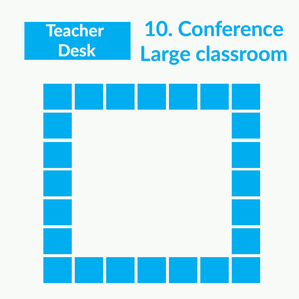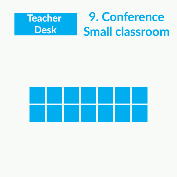 Ви навчаєте невелику групу учнів? У цьому випадку розміщення конференц-клас – ваш варіант. Конференц-клас надає вашим учням уявлення про кімнати для ділових зустрічей. Використовуйте це розміщення при складанні правил для занять, плануванні події, обговорення в класі, тощо. Ви також можете практикувати мовлення (на уроках іноземної), дозволяючи студентам, що сидять один перед одним, розмовляти один з одним.