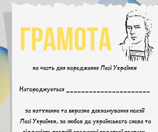 ✔ Грамота до дня народження Лесі Українки (завантажити)