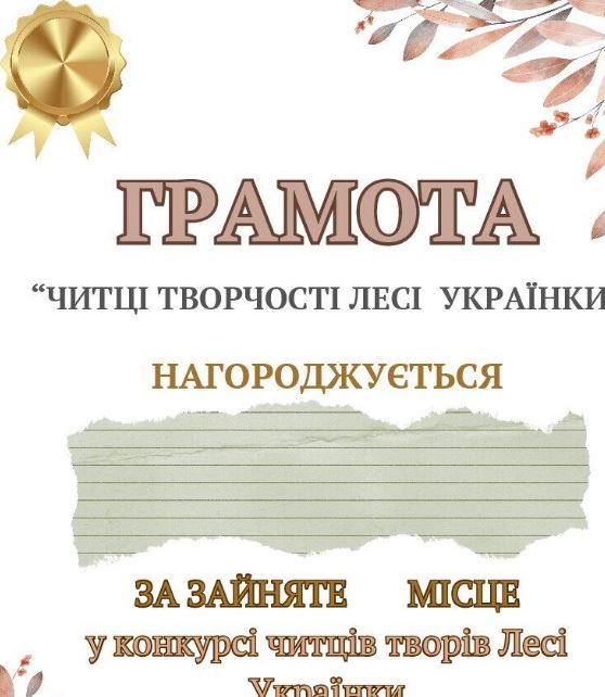 ✔ Грамота «Конкурс читців творів Лесі Українки»