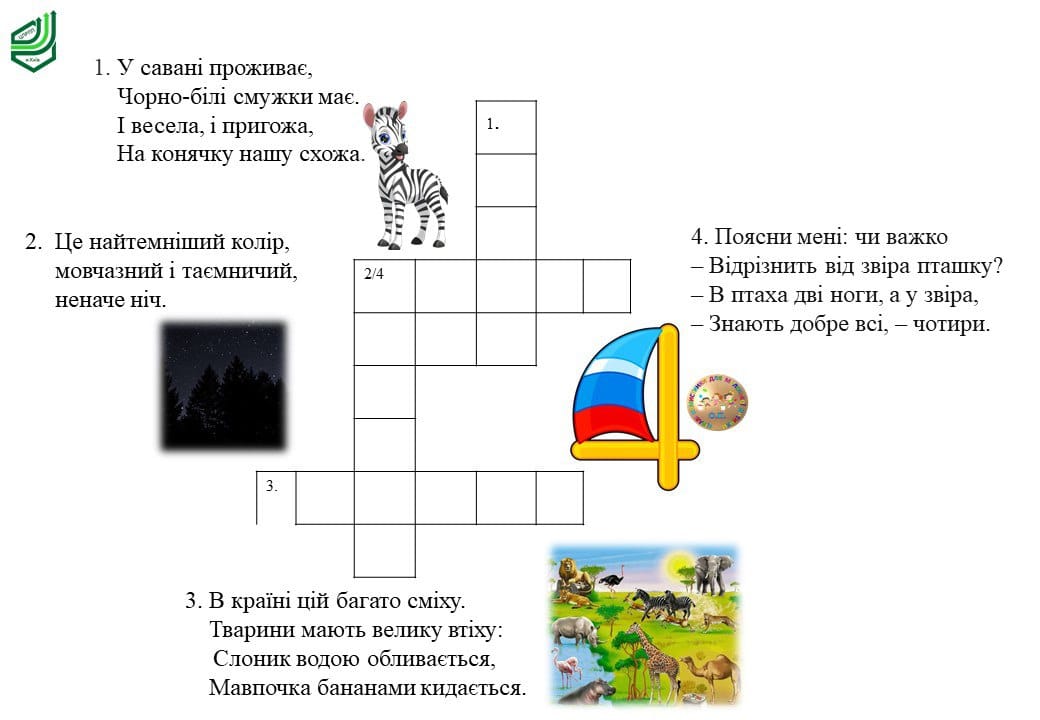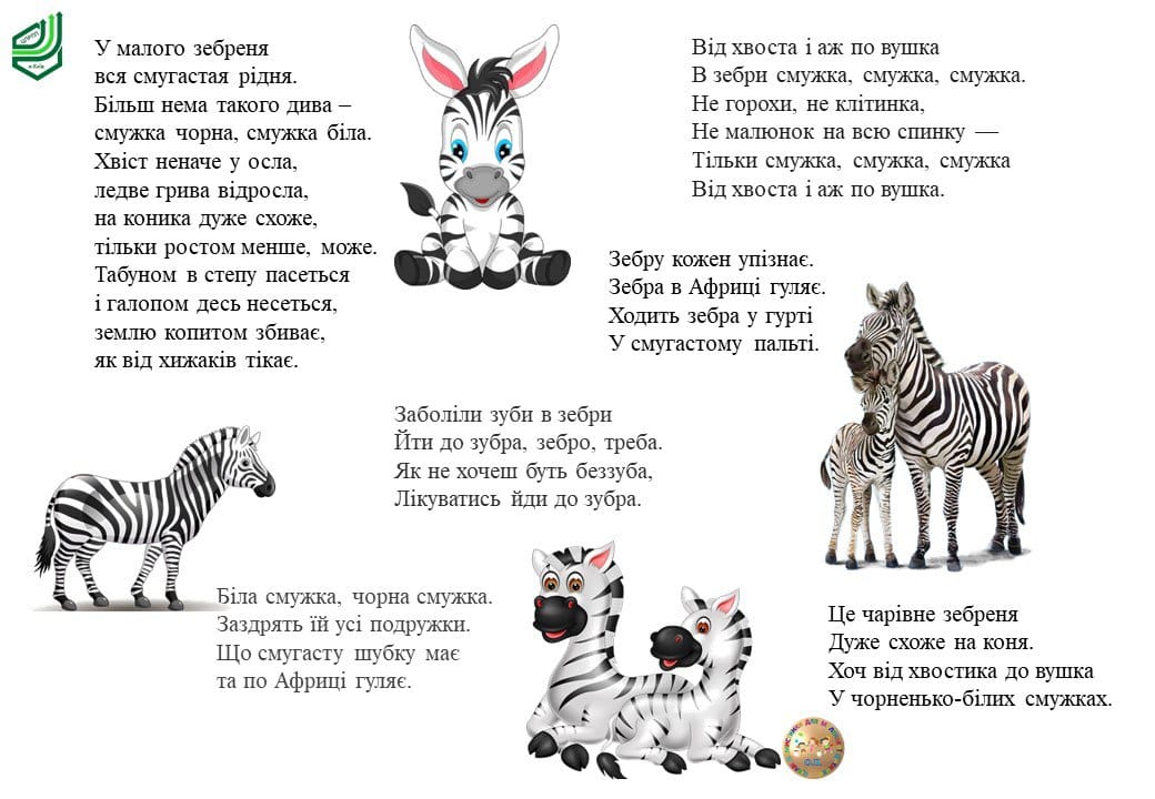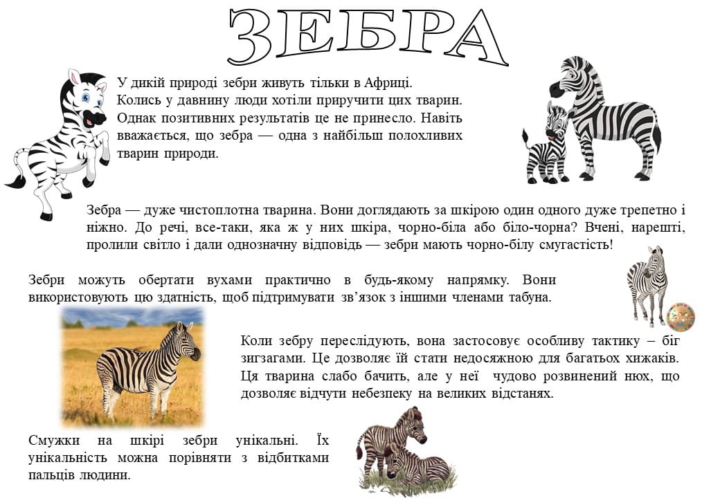 Вічні символи краси та свободи – коні та їх родичі, одні з яких – зебри або, як їх називали в давнину, «Тигрові коні». Напевно найсмугастіші тварини, звісно, після величних тигрів. Зебри – мешканці саван Східної і Південної Африки. Пропонуємо вправи з даної тематики.