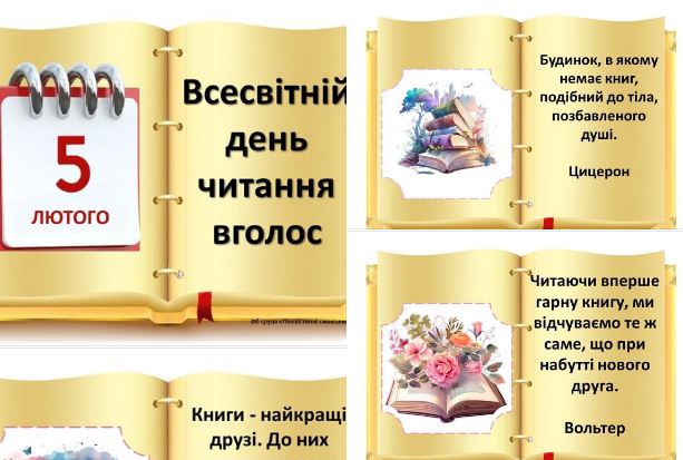 У першу середу лютого світова спільнота книголюбів відзначає Всесвітній день читання вголос. Це свято зініціював у 2010 році Міжнародний освітній проєкт «LitWorld».
