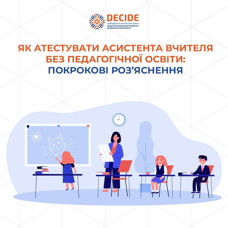 🔹Тема атестації викликає чимало запитань у керівників закладів освіти та самих педагогів. Тому проєкт DECIDE підготував інфографіку, яка пояснює, коли та як атестується асистент учителя, якщо він не має педагогічної освіти.