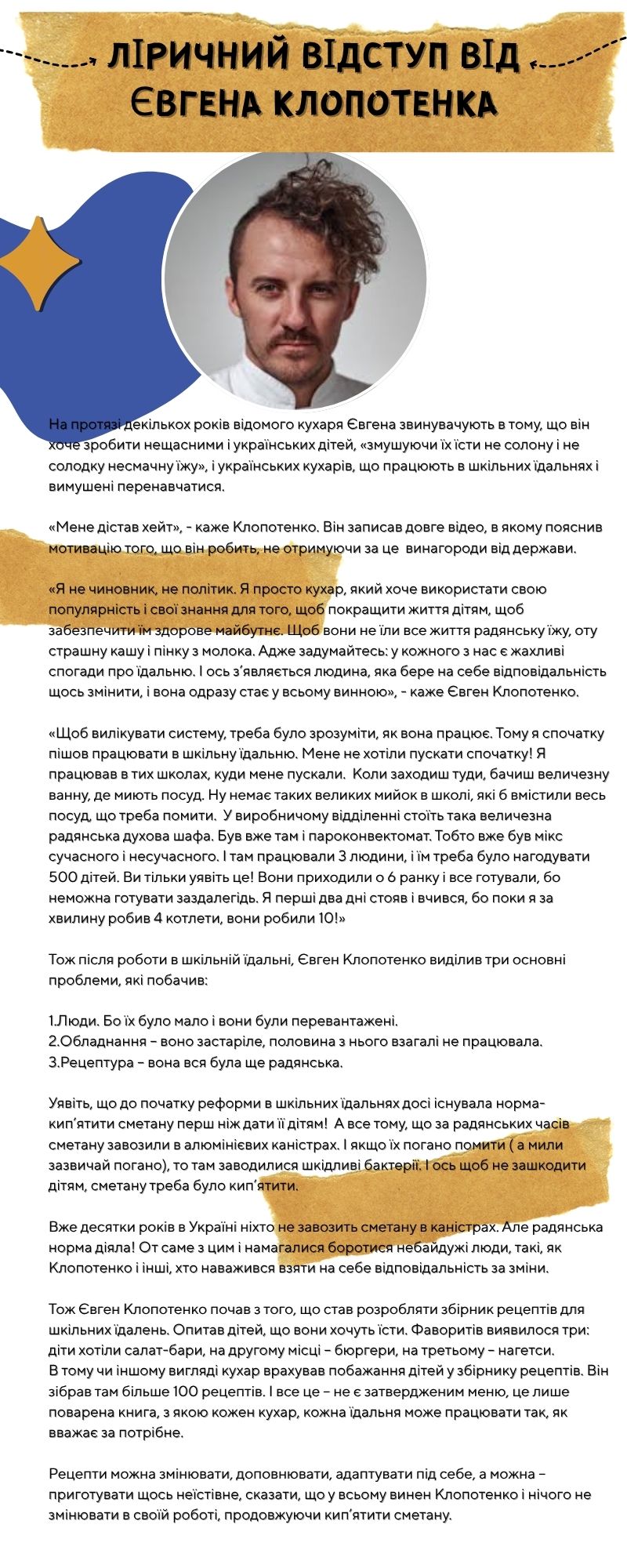 Повну розповідь Євгена Клопотенка про те, як він став частиною реформи шкільного харчування, дивіться на його you-tube-каналі.