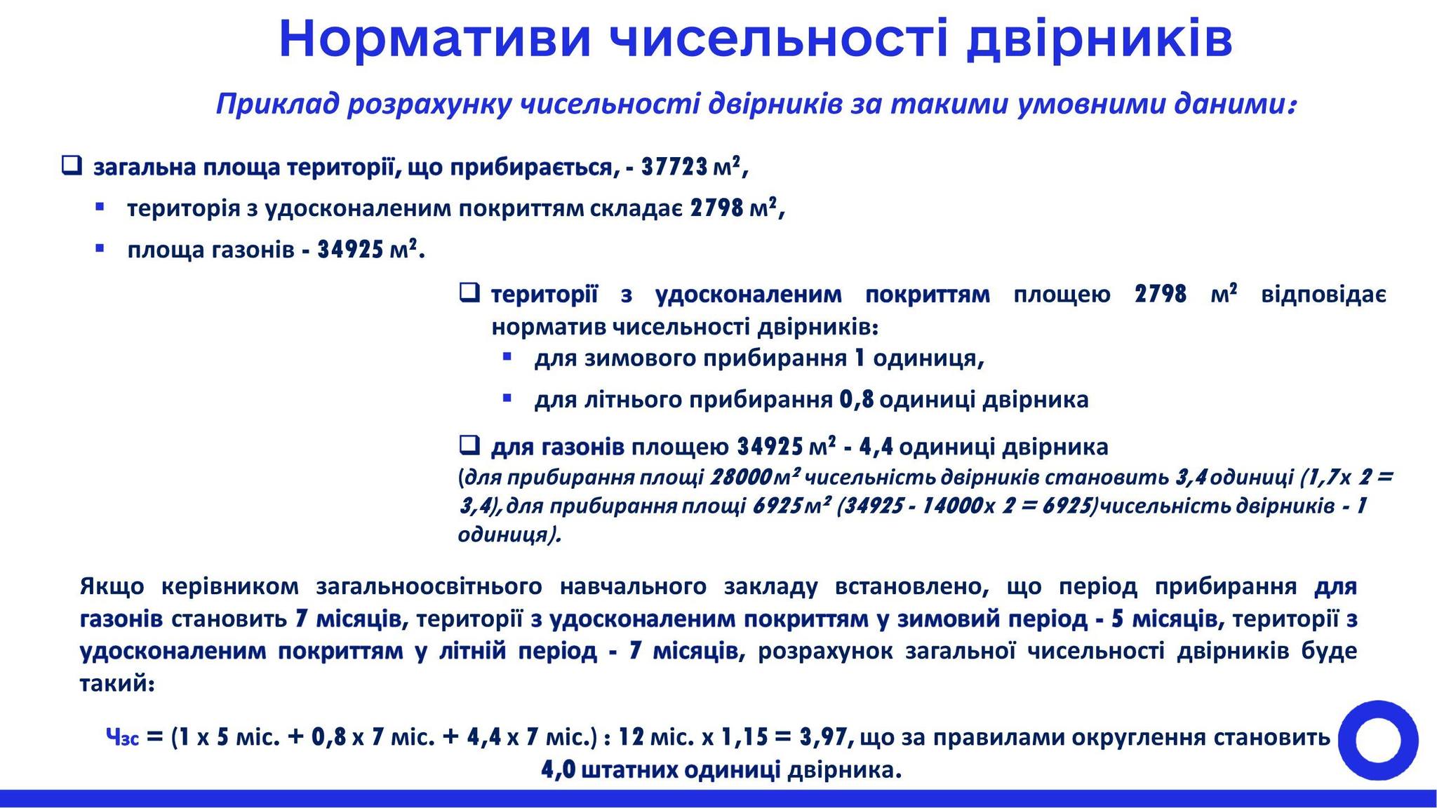 📝Згідно з Типовими штатними нормативами для певного рівня закладів освіти посада двірника вводиться відповідно до встановлених законодавством норм площі, що прибирається.