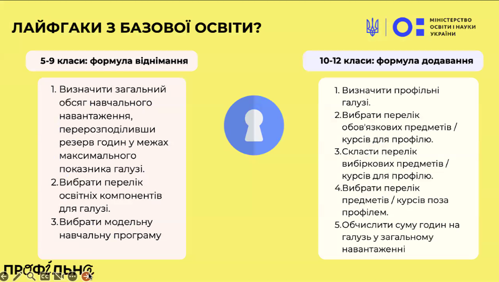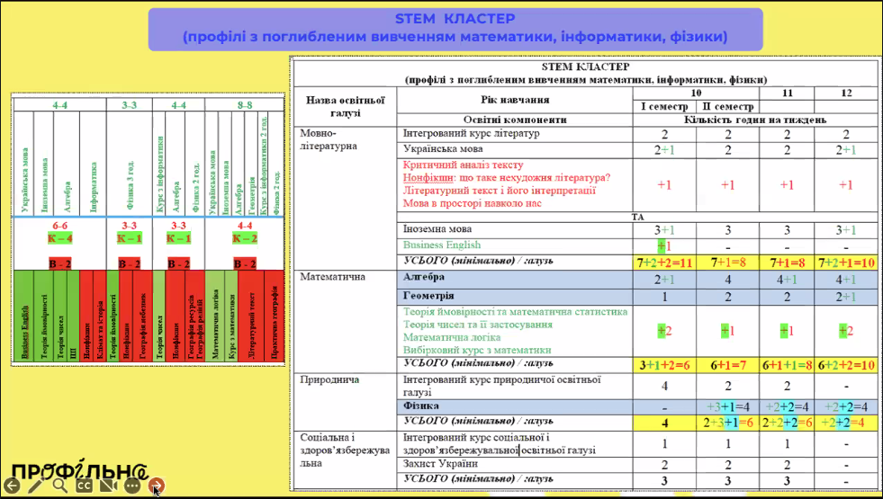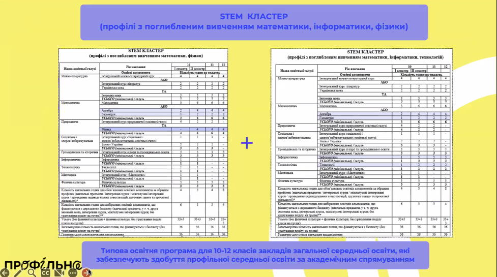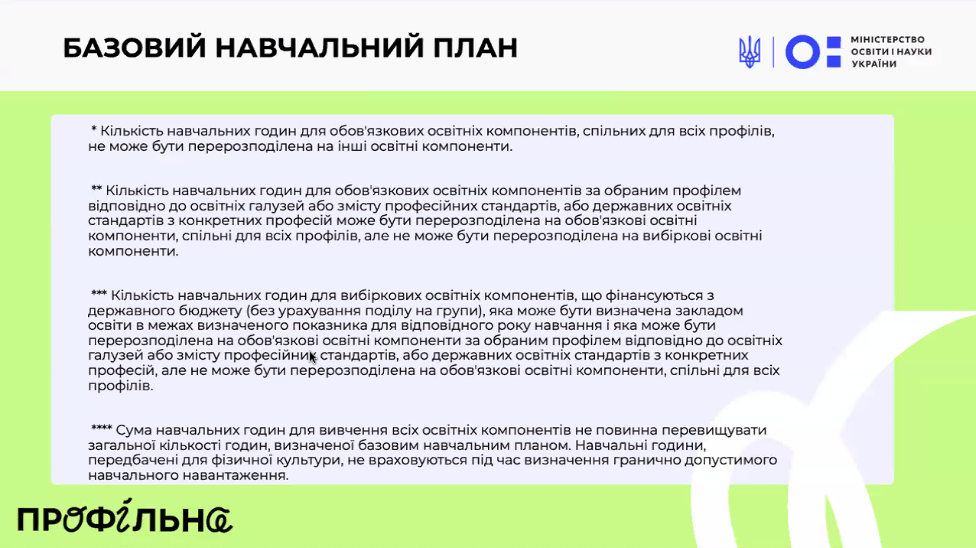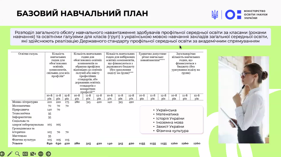 На початку вебінару експерти Міністерства освіти детально розповіли про структуру типової освітньої програми та навчального плану для профільного трирічного ліцею (10–12 класи). Базовий навчальний план – додаток до Державного стандарту профільної середньої освіти – визначає, скільки годин відводиться на кожну освітню галузь у 10-му, 11-му і 12-му класах. З цього плану видно, що частину предметів учні вивчатимуть протягом усіх трьох років, а частину – лише на першому чи другому році, якщо ці галузі не є профільними для обраного напряму.
