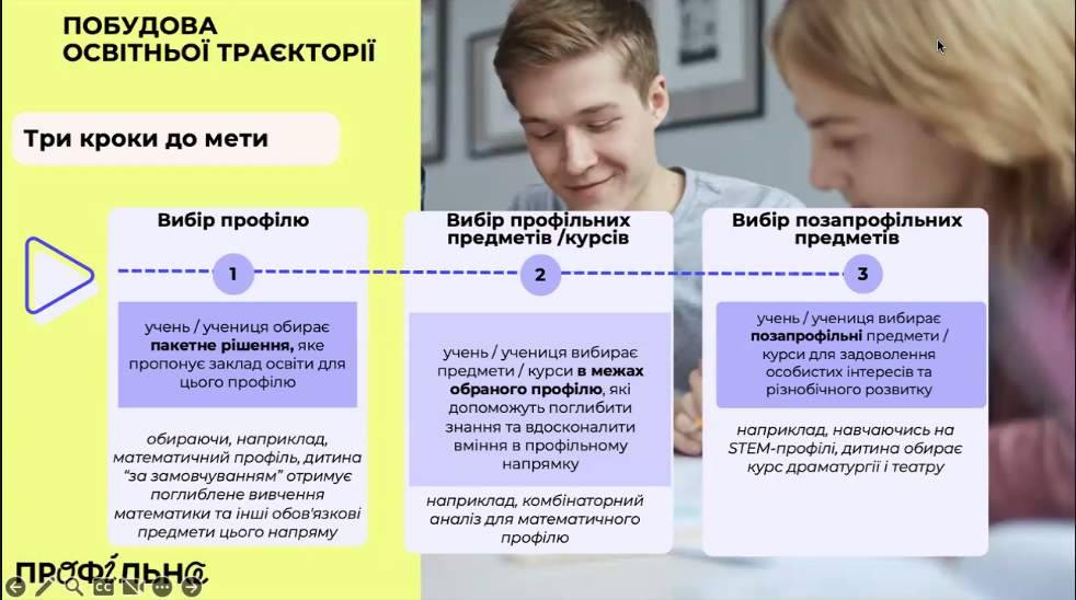 Перший крок – вибір профілю та “пакету” обов’язкових предметів: заклад освіти пропонує готовий набір предметів для профілю, і учень, наприклад, математичного напряму одразу починає вивчати алгебру і геометрію на поглибленому рівні.