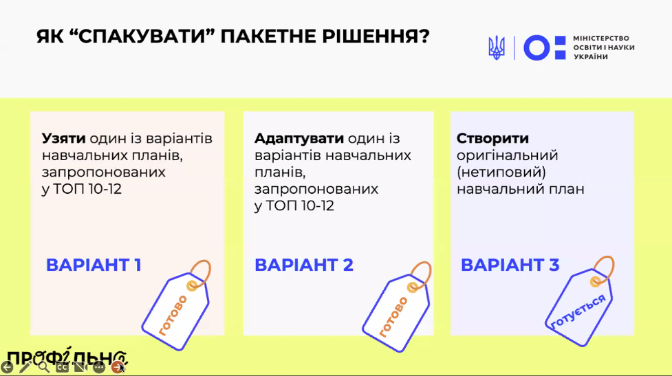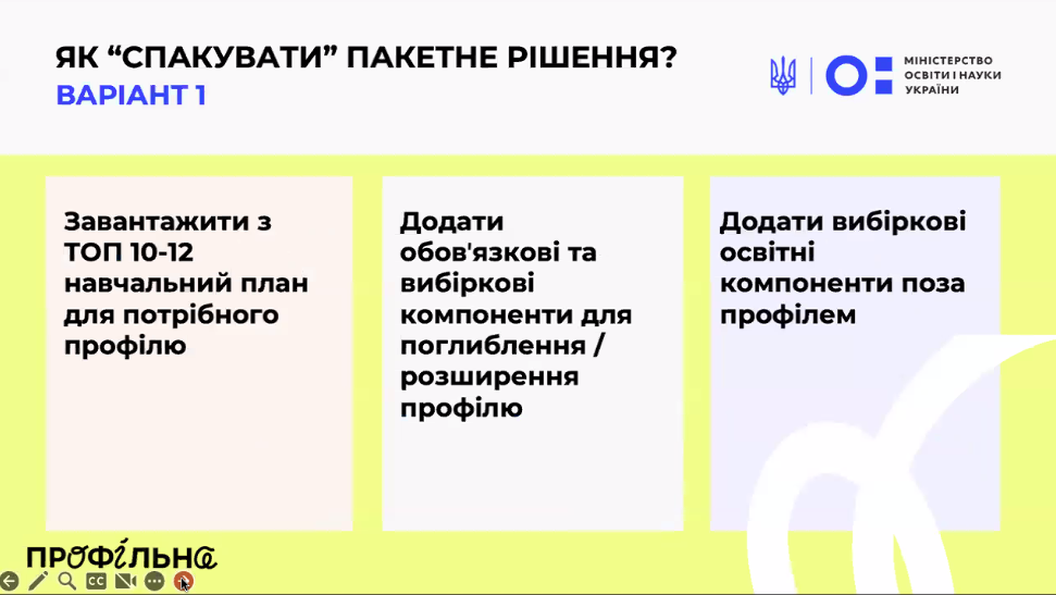 Учасниками вебінару стали представники МОН та двох закладів-учасників першого пілотного етапу - Стрийського ліцею імені Героя України Андрія Корчака та Фастівського академічного ліцею №9, які представили свої навчальні плани.