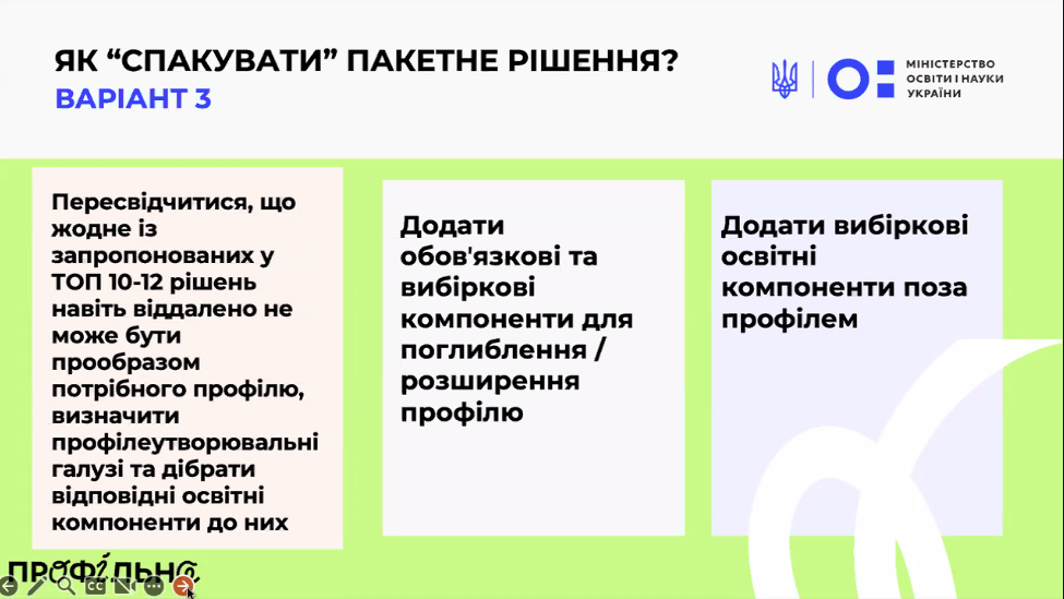 Також експертка порадила дотримуватись логіки спорідненості освітніх галузей: не поєднувати предмети, які не мають спільного методологічного підґрунтя, а будувати профільну траєкторію так, щоб вона відповідала майбутнім академічним цілям учнів.