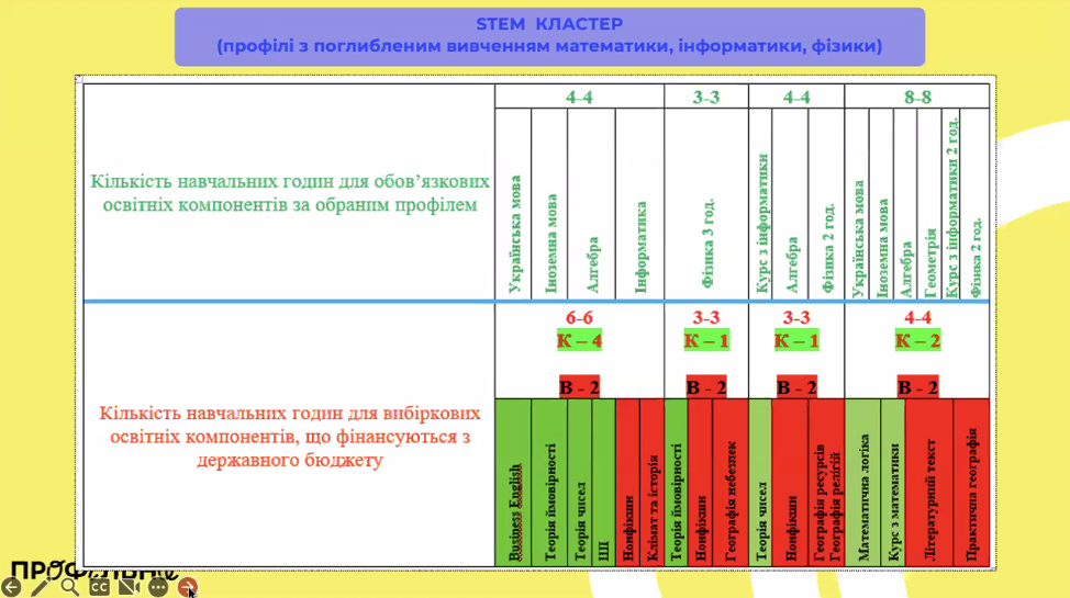 Водночас Романенко наголосила на важливому правилі: мінімум дві години на тиждень повинні залишатися для позапрофільних курсів. “Не можна забирати всі години з третього кошика на профільні предмети. Учням потрібен простір для розвитку, відпочинку й реалізації власних інтересів — від фотошопу до штучного інтелекту”, — зазначила вона.