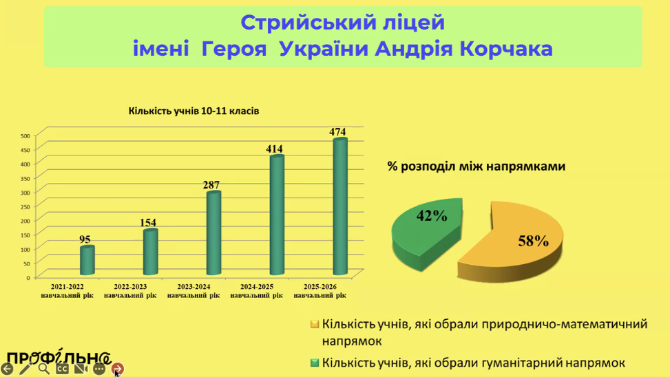 Другим свої напрацювання презентував Стрийський ліцей імені Героя України Андрія Корчака (Львівська обл.), який також пілотує реформу старшої школи. Стрийський ліцей обрав схожий STEM-напрям (профілі з поглибленим вивченням математики, фізики, інформатики), але реалізував його власним способом. Заклад почав перехід до формату академічного ліцею ще у 2022 році: кілька років поспіль тут поступово збільшували набір у 10-ті класи і скорочували кількість молодших, фактично трансформуючись із загальноосвітньої школи на ліцей лише для старшокласників. Наразі у Стрию навчається 474 учні старших класів (10 десятих класів та 9 одинадцятих) – такий масштаб дозволив школі експериментувати з різними профілями та підходами одночасно. Цікавий інсайт: досвід Стрия показав стабільний розподіл уподобань учнів – близько 60% дев’ятикласників обирають природничо-математичні профілі, а 40% – гуманітарні (у різні роки співвідношення коливається в межах 58–61% проти 39–42%). Усвідомлюючи цей попит на STEM, ліцей вирішив запропонувати профіль, що поєднує одразу три предмети на профільному рівні: математику, фізику та інформатику.