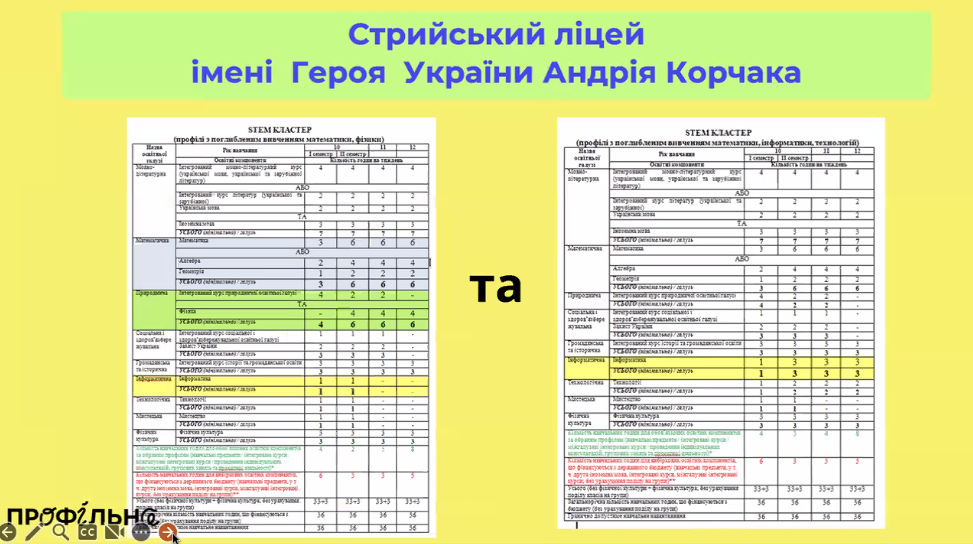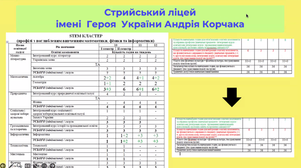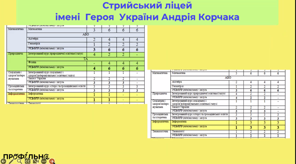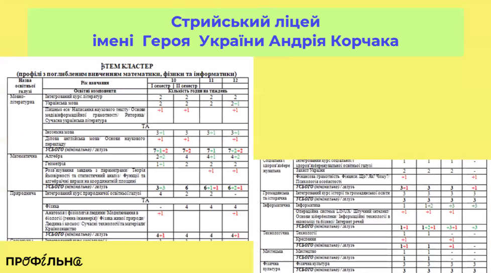 “Приправили план годинами інформатики”. Стрийський ліцей, як і колеги з Фастова, узяв за основу два типових плани – STEM-план з поглибленою математикою і фізикою та план з поглибленою математикою, інформатикою і технологіями. “Ми були більш енергозберігаючими – просто взяли за основу навчальний план, де математика і фізика вже вивчаються на профільному рівні, і приправили цей навчальний план годинами інформатики”, – зазначають представники ліцею. Інакше кажучи, до типового “матфізичного” профілю додали додаткові години інформатики, нічого не забираючи з інших компонентів. У результаті вдалося отримати збалансований трьохпредметний STEM-профіль. “Ми нічого не забирали, ми додавали. І я сьогодні подивована, що прийшли різними шляхами, але прийшли до одного [навчального] плану [що й колеги]”, – зазначила в.о. директора Ірина Сьомачок, підкресливши, що незалежно один від одного обидва ліцеї-учасники пілоту виробили дуже схожі рішення.