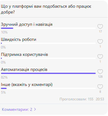 У запитанні “Що у платформі вам подобається або працює добре?” користувачі відзначили лише один аспект: