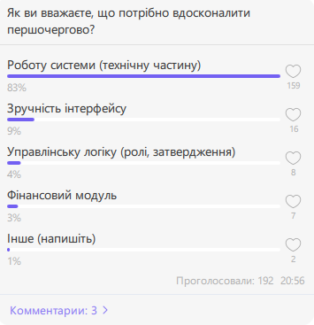 ✔ 69% опитаних вважають, що блок “Звіти і аналітика” потребує найбільшого доопрацювання.