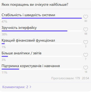 ✔ 47% очікують найбільше покращень саме щодо стабільності і швидкості системи.