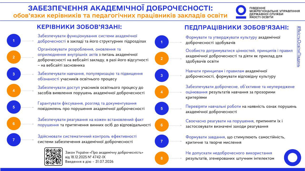 ✔️ Забезпечення академічної доброчесності: обов’язки керівників та педагогічних працівників закладу освіти