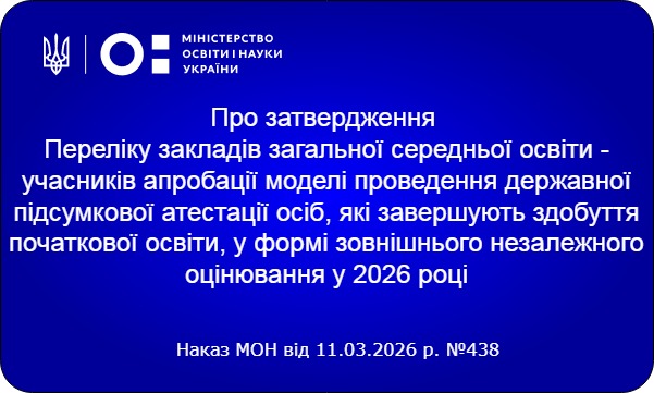 Визначено перелік закладів загальної середньої освіти учасників апробації моделі проведення державної підсумкової атестації осіб, які завершують здобуття початкової освіти, у формі зовнішнього незалежного оцінювання у 2026 році: