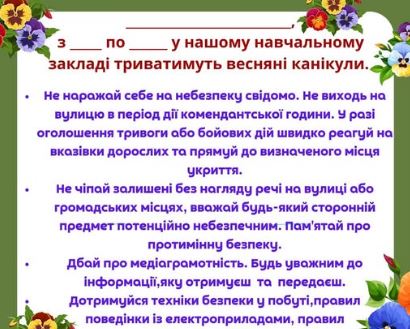 ✔ Презентація "Безпека на весняних канікулах під час воєнного стану" (завантажити)