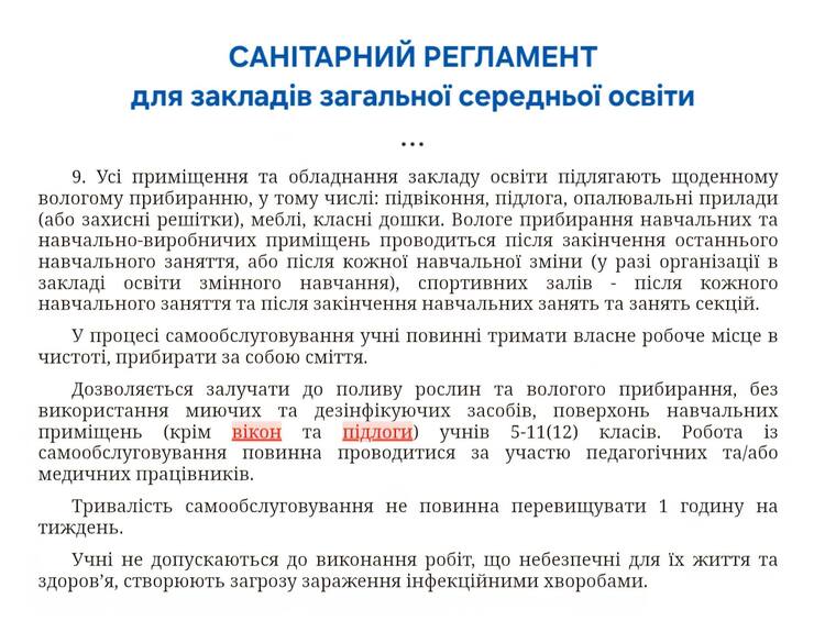 Учнів 5-11(12) класів дозволяється залучати до вологого прибирання поверхонь КРІМ ВІКОН ТА ПІДЛОГИ. Також категорично заборонено використовувати учнями миючі та дезінфікуючі засоби.