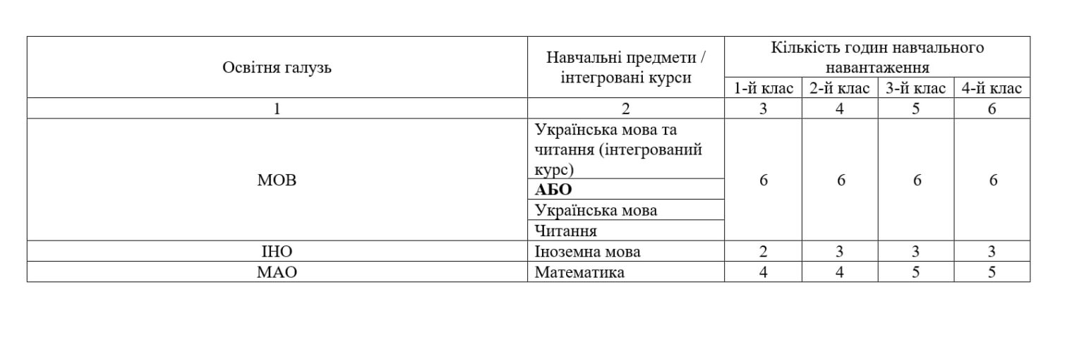 У таблиці навчального навантаження, оприлюдненої в додатках до проєкту, у рядку «Українська мова та читання (інтегрований курс)» зазначено по 6 годин для 1, 2, 3 і 4 класів.