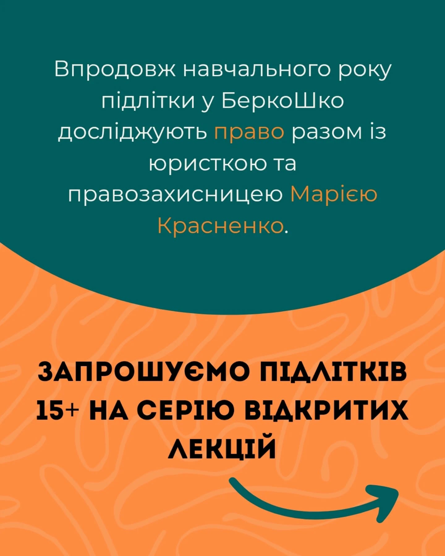Впродовж навчального року підлітки у БеркоШко досліджують право разом із юристкою та правозахисницею Марією Красненко. Говорять про державу і Конституцію, про права людини під час війни, про відповідальність, свободу слова, інструменти впливу на рішення влади. Це не суто теоретичні розмови, а розбір реальних кейсів, обговорення етичних дилем і практичні завдання.