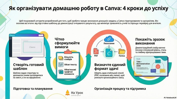 Щоб цифрове домашнє завдання в Canva було ефективним і зрозумілим для учнів, варто дотримуватися простого покрокового алгоритму. Кожен етап допомагає організувати роботу так, щоб учні могли сконцентруватися на змісті, проявити творчість і подати свої ідеї структуровано: