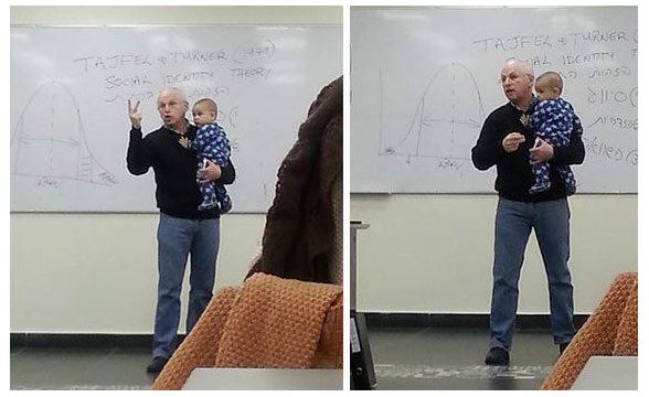Це 67-річний австралійський професор Сідні Енгельберг, який читає лекцію з організаційної поведінки в Єврейському університеті в Єрусалимі. На руках у нього дитина студентки. Ця дитина вередувала і заважала проводити заняття, а у професора на руках швидко заспокоїлася.