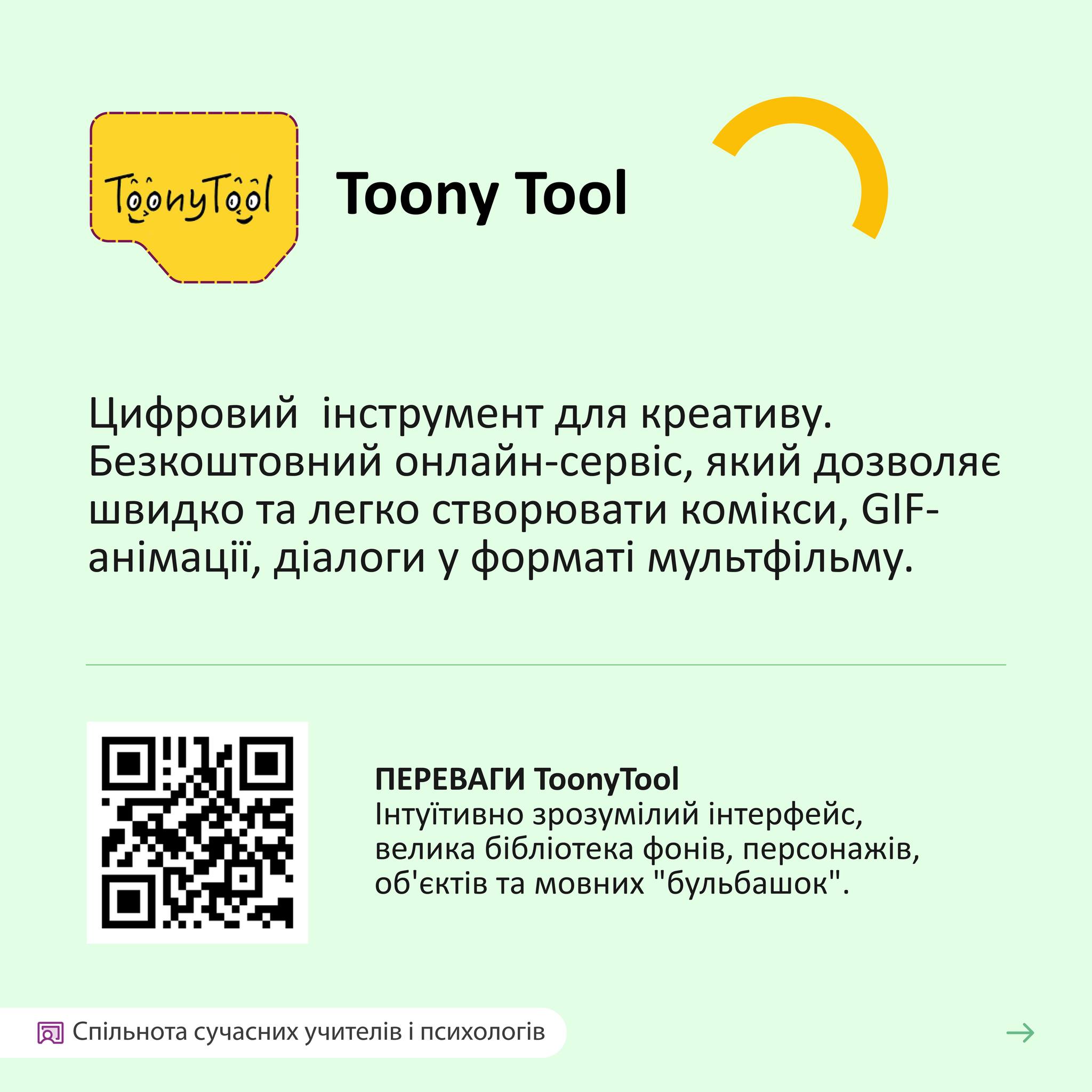 ToonyTool — це простий і безкоштовний онлайн-сервіс, який дозволяє швидко створювати яскраві комікси, діалоги, GIF-анімацію та відеофайли. Його можна назвати конструктором мультяшних історій. Ідеально для тих, хто хоче додати гумору та візуалізації до своїх уроків, заохочуючи учнів до творчої роботи.