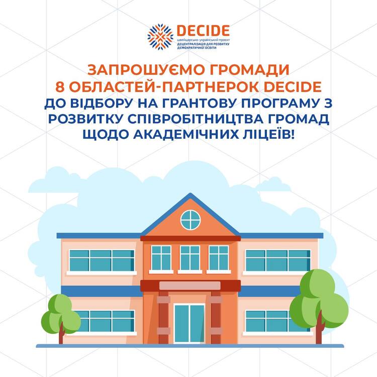 🔔 Запрошуємо громади 8 областей-партнерок DECIDE до відбору на грантову програму з розвитку співробітництва громад щодо академічних ліцеїв!