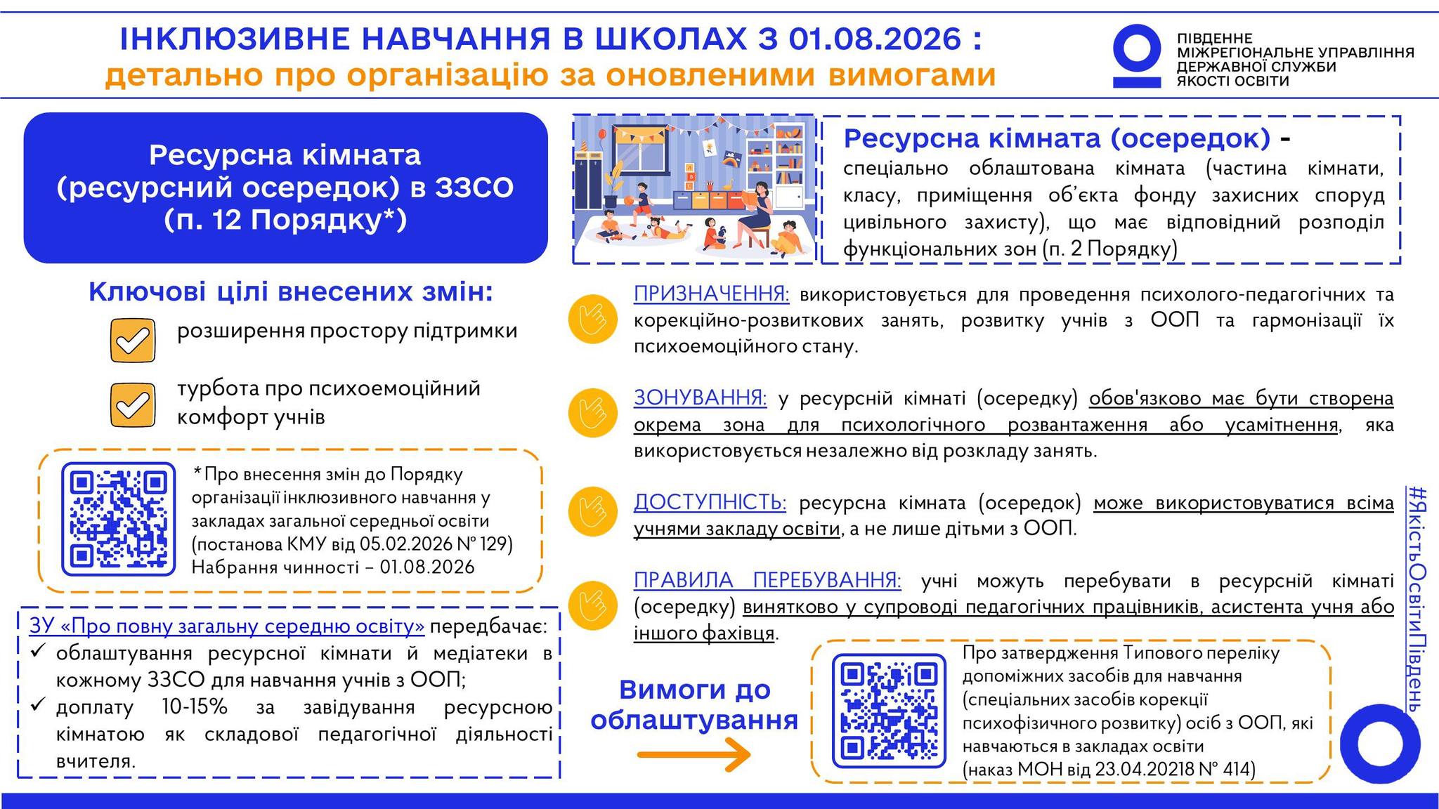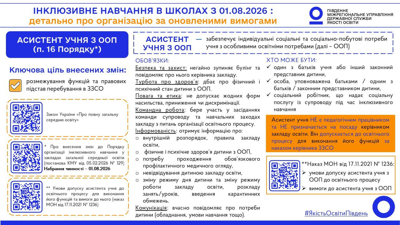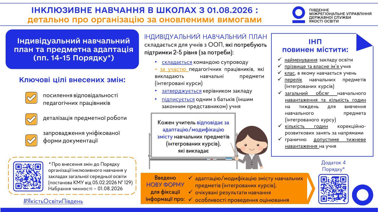 Команда Південного міжрегіонального управління Державної служби якості освіти підготувала серію візуальних матеріалів щодо ключових змін та новацій Порядку, які стануть у пригоді закладам загальної середньої освіти, їх керівникам та засновникам, для належної організації якісного освітнього процесу для учнів з особливими освітніми потребами за оновленими вимогами.
