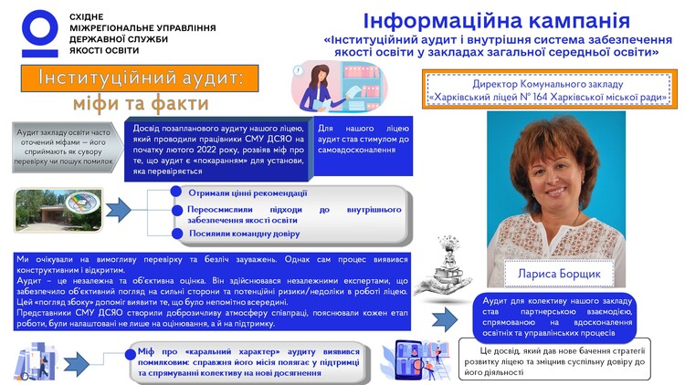 Директор Комунального закладу «Харківський ліцей № 164 Харківської міської ради» Лариса Борщик поділилась своїми враженнями після проходження позапланового інституційного аудиту на початку лютого 2022 року: