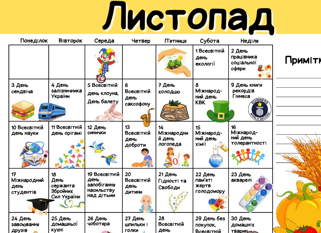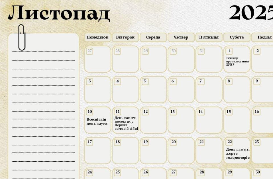 ✔ Календар свят, пам'ятних дат та подій на листопад 2025 (кожне свято на окремому аркуші) (завантажити)