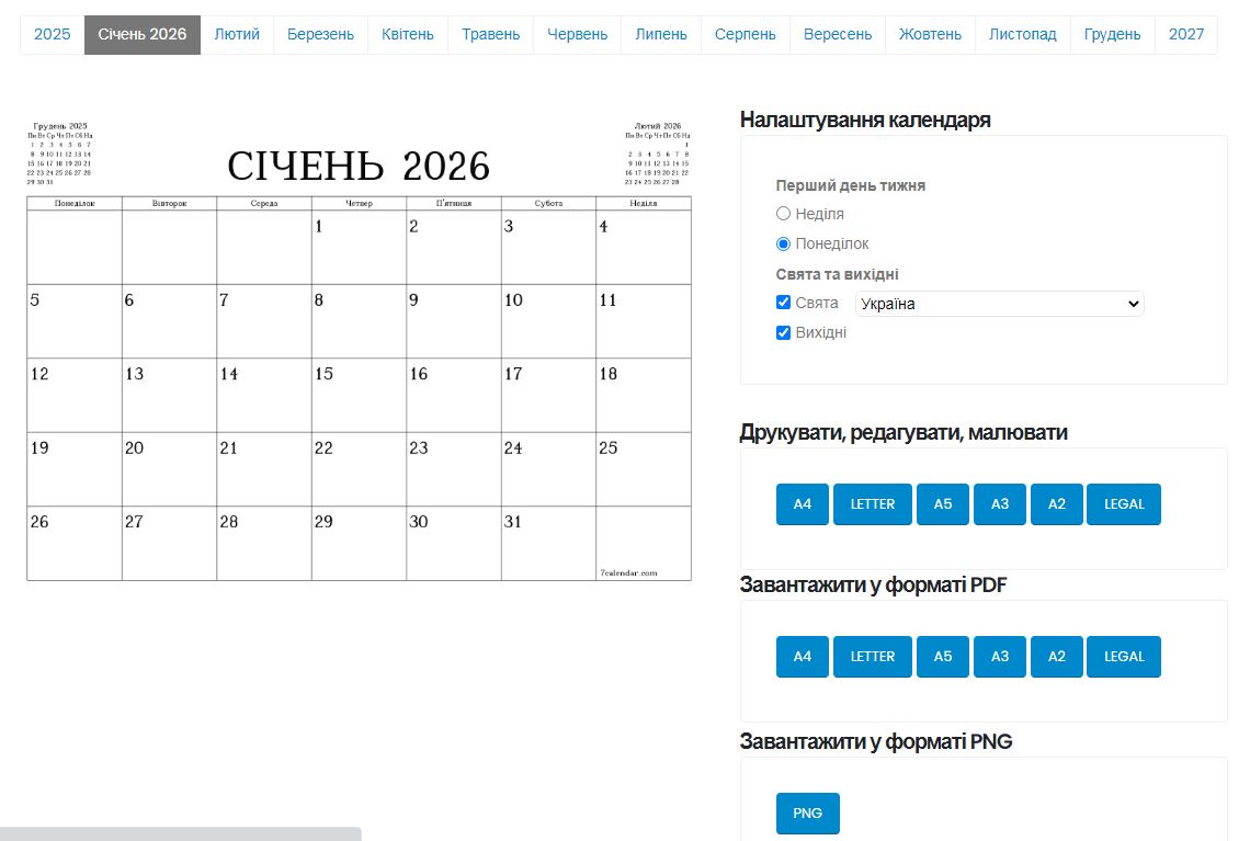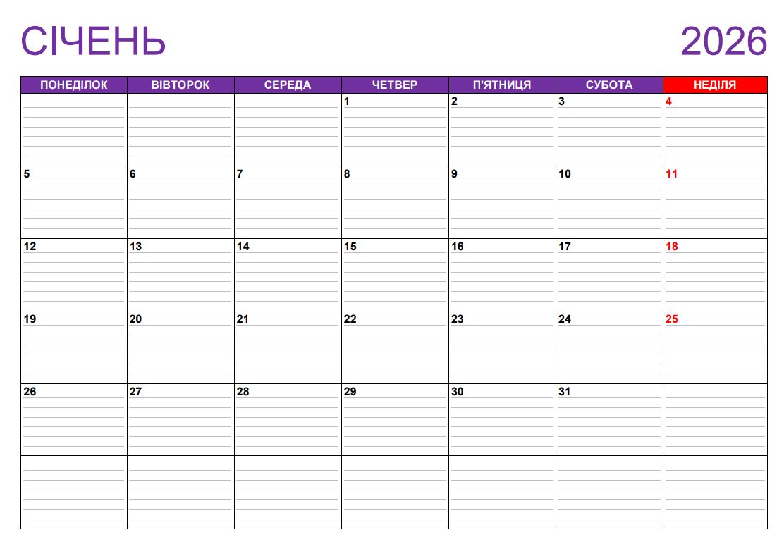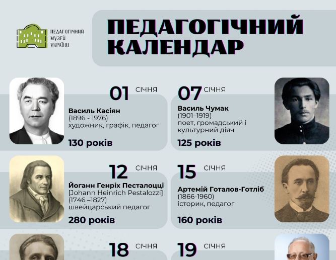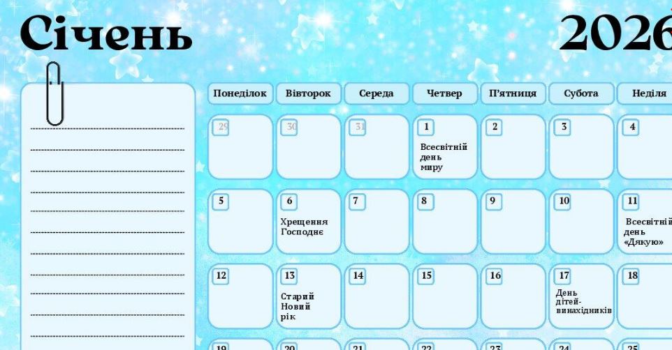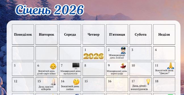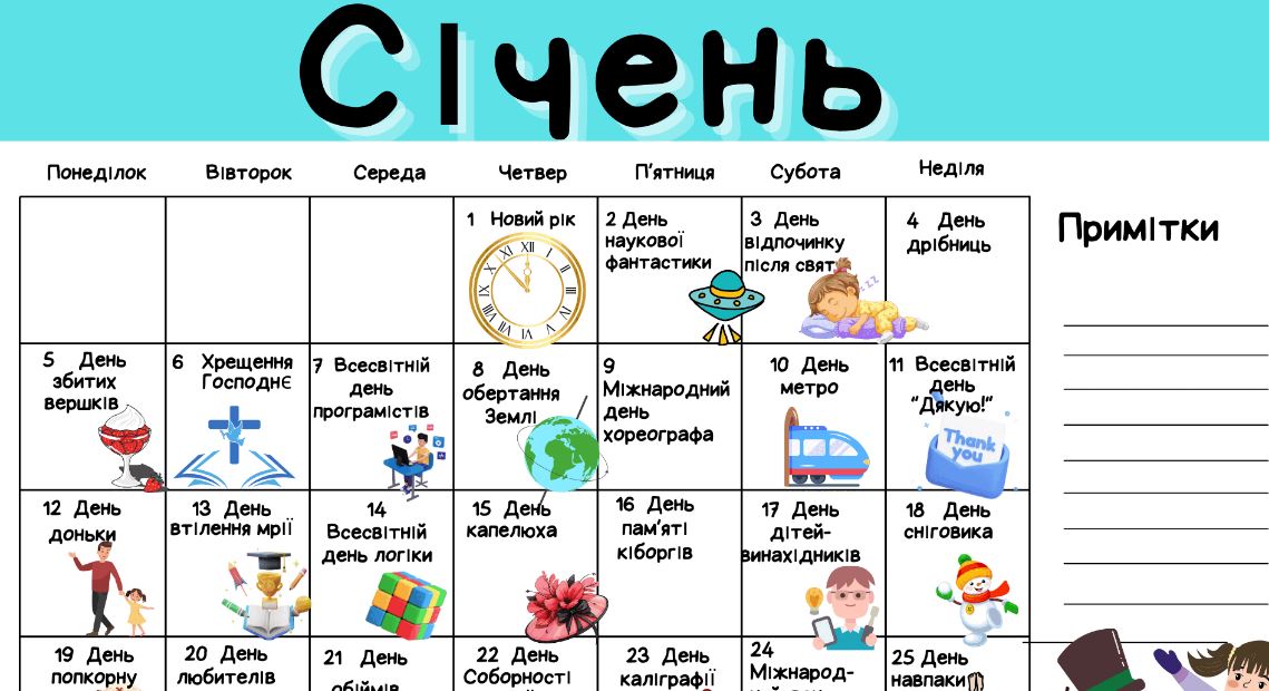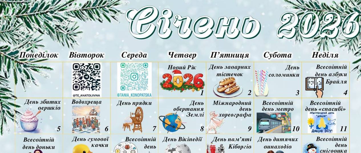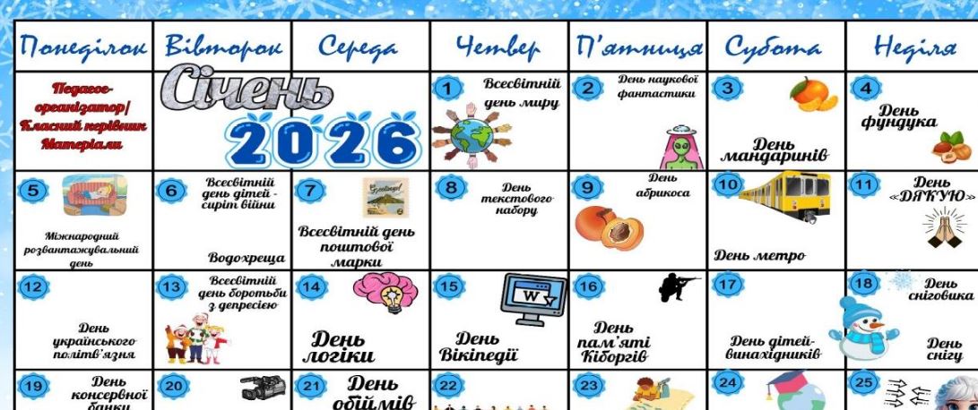 ✔ Педагогічний календар. Січень 2026 (завантажити)