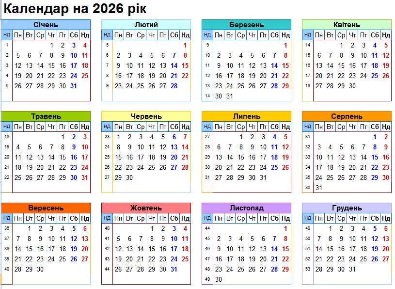 ✔ Календар в Екселі на 2026 рік (завантажити)