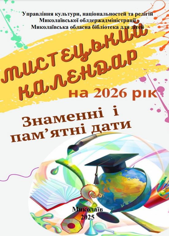 ✔ Мистецький календар на 2026 рік : знаменні і пам’ятні дати / уклад. Н. Коваль ; ред. В. Тарасова ; Миколаївська обл. б-ка для дітей. – Миколаїв, 2025 – 19 с. (завантажити)