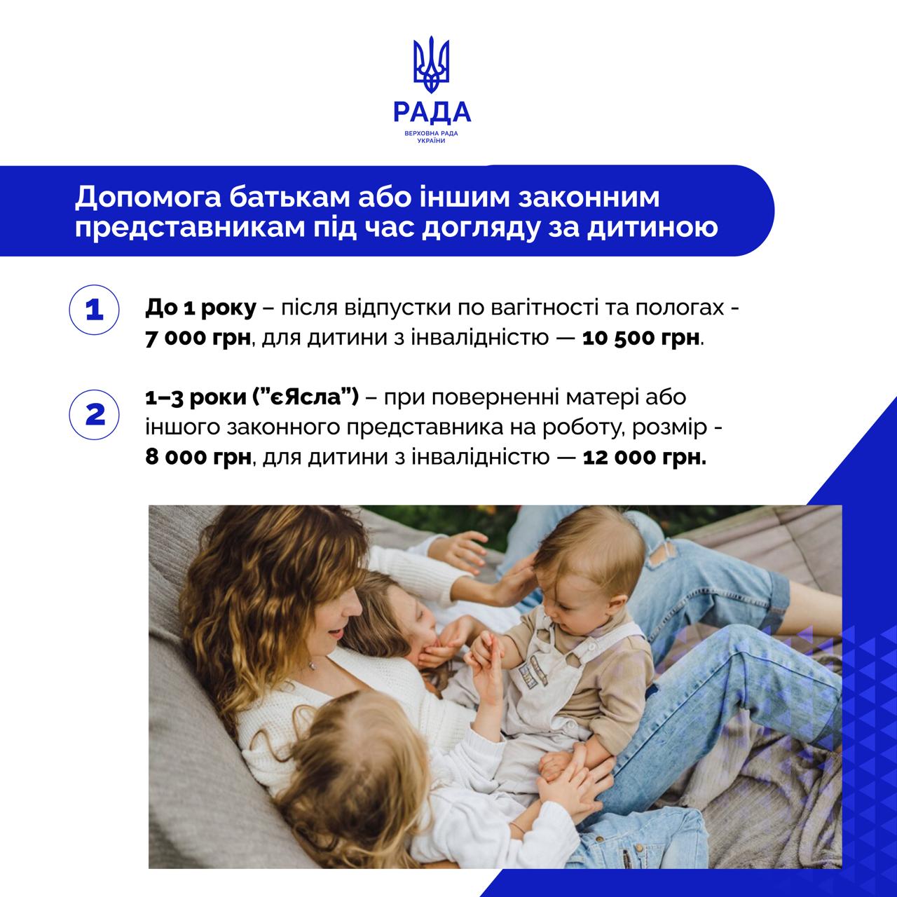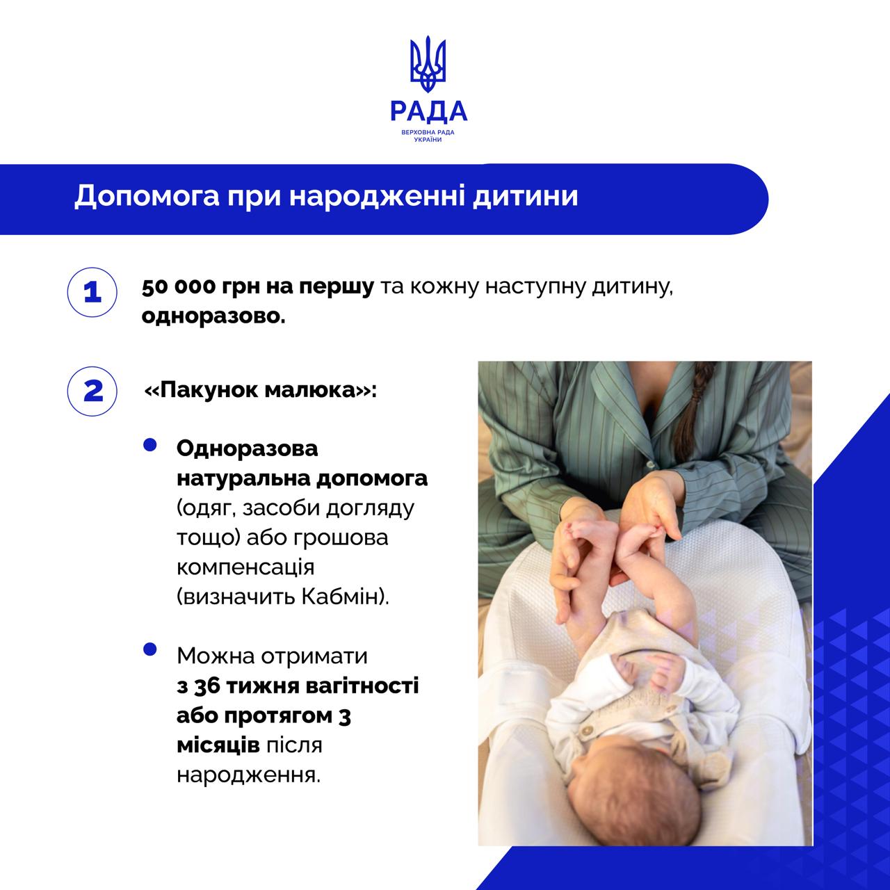 З 1 січня 2026 року в Україні починає діяти Закон, який передбачає допомогу під час вагітності та пологів, допомогу при народженні кожної дитини, “Пакунок малюка”, щомісячну допомогу з догляду за дітьми від народження, підтримку першокласників, а також сімей, які виховують дітей з інвалідністю (№ 4681-IX).