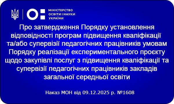 Відповідний наказ МОН від 09.12.2025 № 1608 затверджує порядок встановлення відповідності програм підвищення кваліфікації та/або супервізії педагогічних працівників умовам цього проєкту.