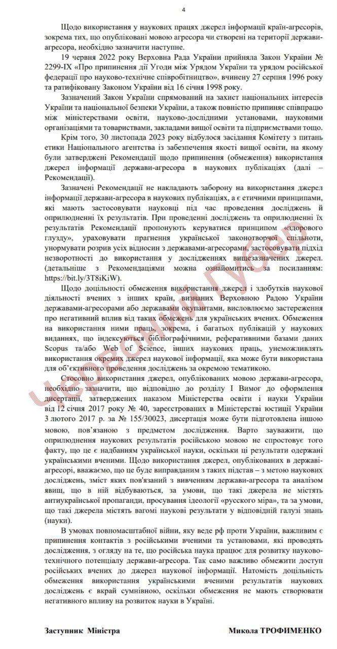 У науці використання джерел держави-агресора не заборонене, а дисертації можуть бути іншою мовою (крім державної), якщо так зумовлює предмет дослідження. Водночас МОН наголошує, що заборона українським ученим користуватися джерелами та науковими здобутками країн-агресорів матиме негативний вплив на якість досліджень.