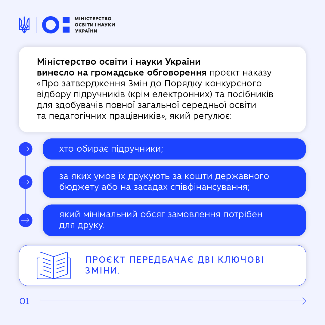 📚 МОН запрошує долучитися до громадського обговорення змін до наказу №1001, який регулює порядок конкурсного добору підручників і навчальних посібників.
