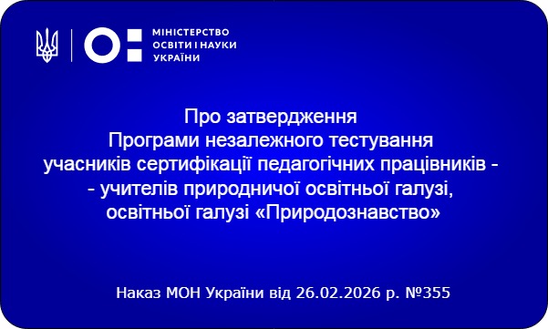 Міністерство освіти і науки України офіційно затвердило Програму незалежного тестування для вчителів природничої освітньої галузі та галузі «Природознавство», які беруть участь у сертифікації педагогічних працівників. Відповідний наказ № 355 було підписано Міністром Оксеном Лісовим 26 лютого 2026 року.