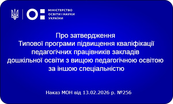 Наказ МОН від 13.02.2026 р. №256" Про затвердження Типової програми підвищення кваліфікації педагогічних працівників закладів дошкільної освіти з вищою педагогічною освітою за іншою спеціальністю"