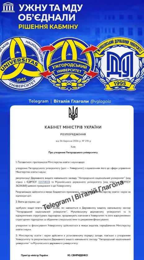 У документі вказано, що Кабмін погодився з пропозицією Міністерства освіти і науки України щодо створення єдиного Ужгородського університету. Для цього реорганізують Ужгородський національний університет та Мукачівський державний університет.