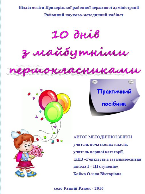 ✔ 10 днів з майбутніми першокласниками.: Практичний посібник / Бойко Олена Вікторівна - КНЗ «Гейківська ЗОШ І-ІІІ ступенів» . - 2016. - 57 с. (завантажити)