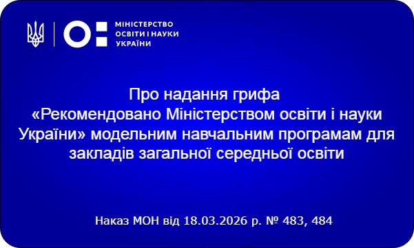 Наказом МОН від 18.03.2026 р. №483 надано гриф модельним навчальним програмам: